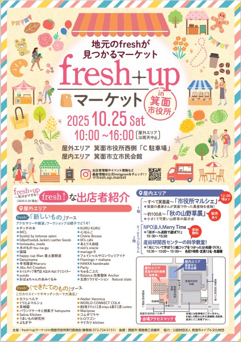 「fresh+upマーケットin箕面市役所」は、地域の出展者を主役に、自治体・観光・商工会・企業が協働してつくる“新しいマーケットの形”として、3 回目の開催を迎えました。