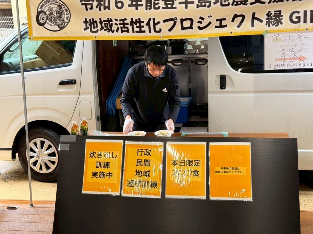 訓練では、縁GINが運営するキッチンカーによる炊き出しのほか、水や備蓄食材など地域で備えている資源を活用。