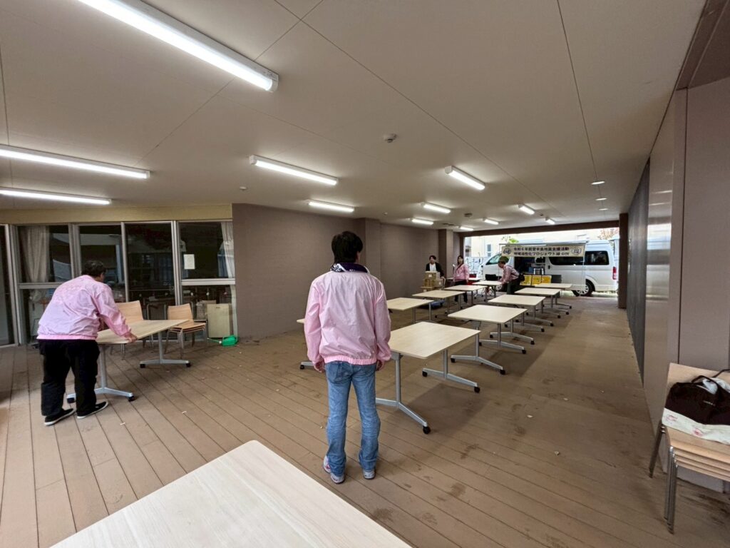 当日の朝、キッチンカーが小学校に到着すると、地域住民・PTA・防災委員の皆さんが協力し、テーブルや椅子の設営、食事スペースの確保などを手際よく準備。