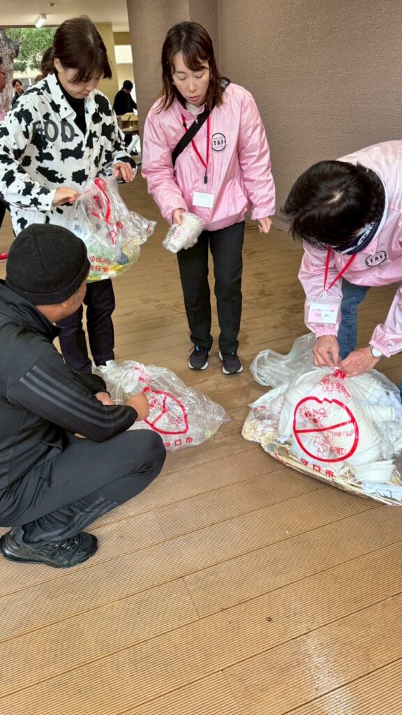 配給や列整備、ゴミ分別、片付けまで一連の流れを体験し、災害時に必要な連携と段取りを確認しました。