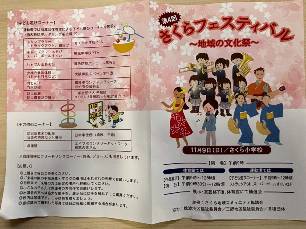 2025年11月9日、大阪府守口市のさくら小学校で、地域コミュニティ協議会主催の「さくらフェスティバル」にて、防災をテーマとした炊き出し・非常食試食訓練が行われました。
