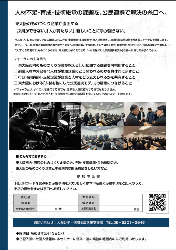 採用や育成、技術継承に悩む企業にとっても、地域支援を強化したい行政・金融機関にとっても、新しい関わり方を探す外部人材や支援企業にとっても、このフォーラムは新たな一歩となるはずです。